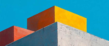This high-resolution image features a textured wall painted in bold blocks of blue, orange, and red, segmented by visible cracks and crevices that add depth and character. The composition is lit by a bright sunlight from the top right corner, creating a striking contrast of light and shadow. This vibrant, abstract color block design is perfect for backgrounds, artistic compositions, and illustrations that require a touch of vivid, dynamic color.