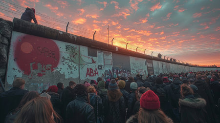 A large crowd gathers in front of a historical graffiti-covered wall during a picturesque sunset, symbolizing unity and change. The vibrant sky adds drama and emotion to the scene.