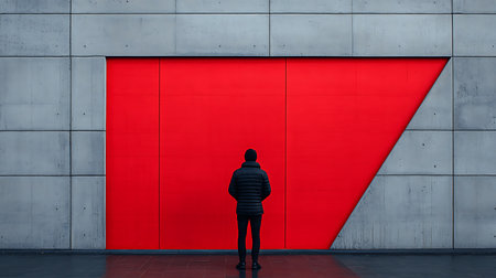 Generative AI Image of Urban Abstract Portrait Man Standing in Vibrant Red Wall Building Background