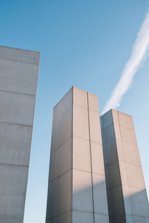 AI Generated. Architectural view of two modern concrete towers reaching towards the clear blue sky