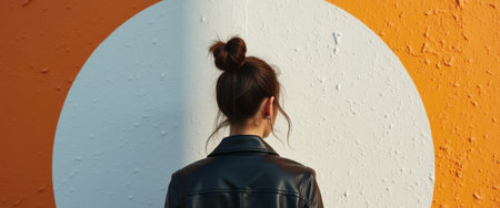 A fashionable woman with her hair in a bun stands with her back to the camera, showcasing a striking orange wall with a large white circle. The bold colors and minimalist composition create a modern and artistic vibe, inviting viewers to appreciate the beauty of simplicity and style.
