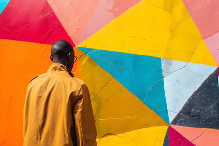 Side view portrait of an african american man wearing a yellow shirt standing in front of a colorful painted wall