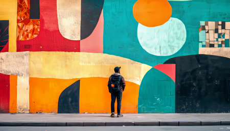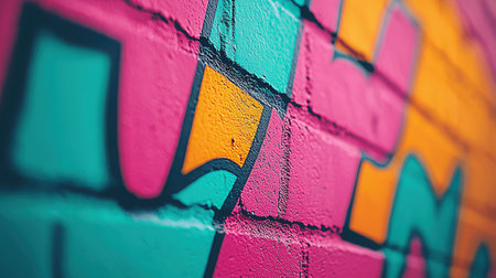 A vibrant and colorful abstract mural painted on a brick wall, featuring bold patterns and dynamic shapes. Perfect for creative projects and urban themes.