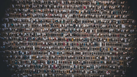 Vast number of people observed from above, engaged in prayer, presenting a powerful scene with a darkened edge effect.