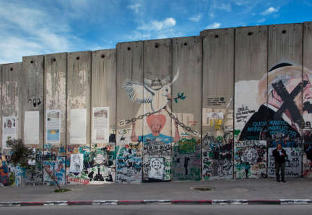 Bethlehem, Palestinian Authority, January 28, 2020: A high wall covered with grafitti, separating the Palestinian Authority from Israel in Bethlehem's hometown of King David and the birthplace of Jesus.
