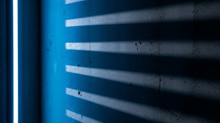 This abstract captures the interplay of light and shadow on a rough concrete wall. A bright blue neon light source, positioned vertically on the left, casts distinct, parallel striped shadows across the textured surface. The stark contrast between the illuminated areas and the deep shadows creates a dramatic and moody atmosphere. The geometric nature of the shadows adds a modern, to the raw texture of the concrete.