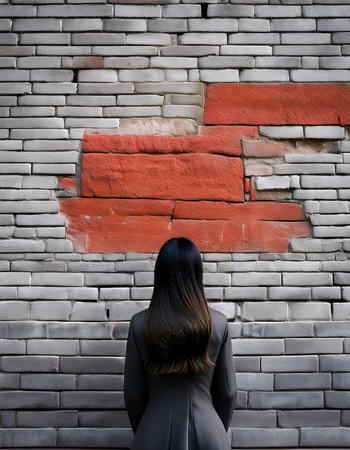Woman looking at brick wall with red paint on it. Concept of wall painting.