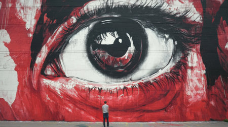 A person stands before an enormous mural, captivated by the striking eye design. The urban artwork showcases bold colors and intricate details, embodying street art culture.