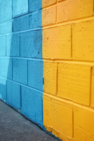 A vibrant wall features alternating blue and yellow bricks, showing their weathered textures and peeling paint. This urban backdrop adds character and a pop of color to the environment.