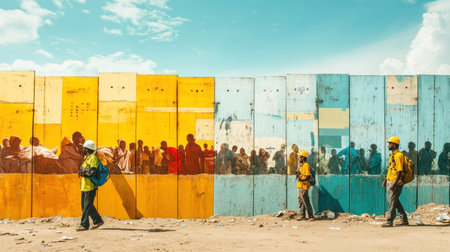 Construction workers walking near a colorful wall with a painting of refugees, highlighting the contrast between labor and displacement