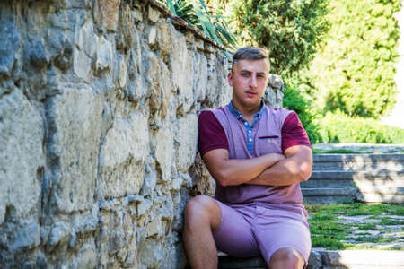 Portrait of stylish fashionable american man sitting at park on stairs, green tree background