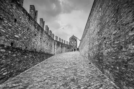 Bellinzona, Switzerland - May 28, 2016: People walking on the walls of Castelgrande castle at Bellinzona on the Swiss alps. Black and white photography.