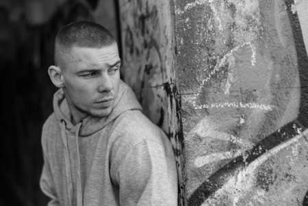 A bully guy in a light sports jacket with a hood. Black and white photo. BW
