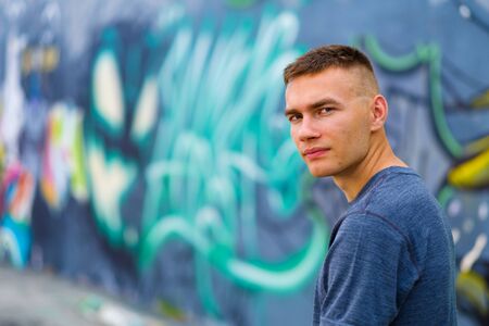 Portrait of young goodlooking man against gray brickwall. Lots of copyspace.