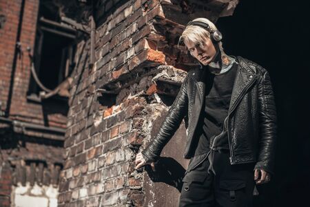 Handsome young unshaven man black hoodie and bandana stands backyard near brick walls summer day. Bearded hipster standing outdoor. Fashionable young adult caucasian guy modern urban clothes