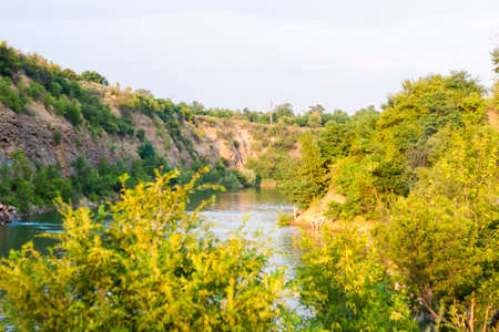 Landscape of a natural canyon at sunset. Rocky coast. At the top of the canyon. There is water below.