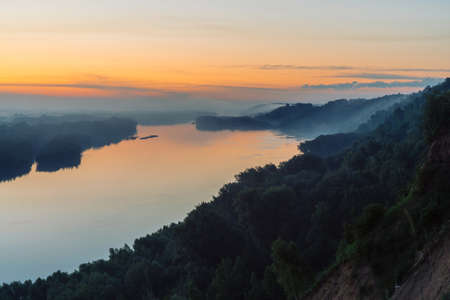 View from high shore on broad river. Riverbank with forest under thick fog. Dawn reflected in water. Yellow glow in picturesque predawn sky. Colorful morning atmospheric landscape of majestic nature.