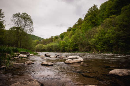 Mountain river flowing through the green forest. ukraine