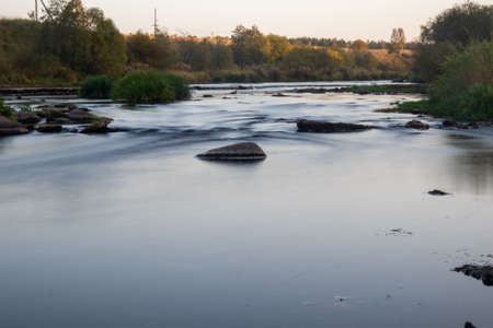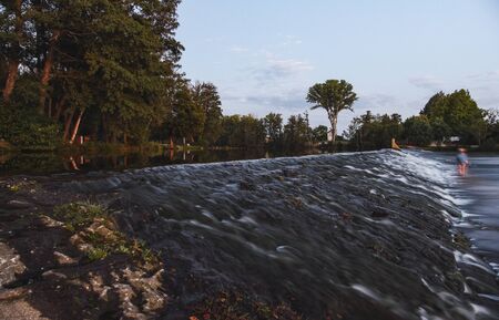 View of a river at sunset with a small waterfall and reflections of the trees in the well. Relating to travel and tourism