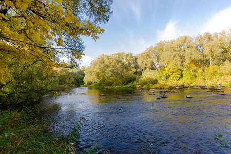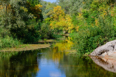 The river is current in the autumn forest. Beauty of autumn nature