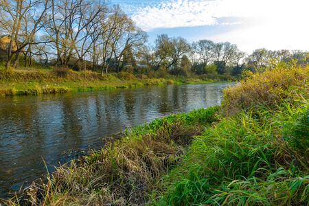 River landscape with sand bank appearing on the shore at low water levles. Small river in the forest. Quiet river in the forest. Trees and bushes on the bank of a small river. Reeds and old trees on the river bank.