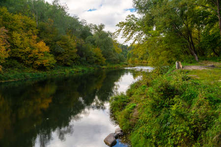 A river with autumn trees and beautiful clouds. Recreation. Travels. Fishing