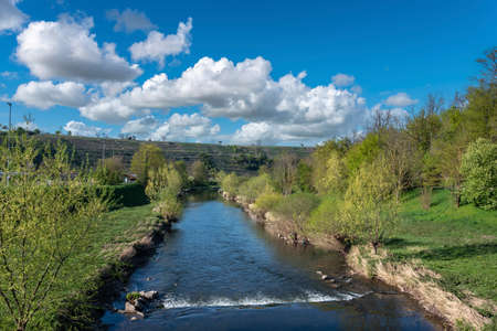 Landscape by Muhlhausen on the Enz with the river Enz and vineyards in the background. Muhlhausen on the Enz is located in Kraichgau in Baden-Wurttemberg in Germany