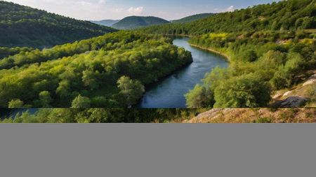 Peaceful river flowing through a green valley, forested hills in the distance, and a clear area of water or sky for copy space.