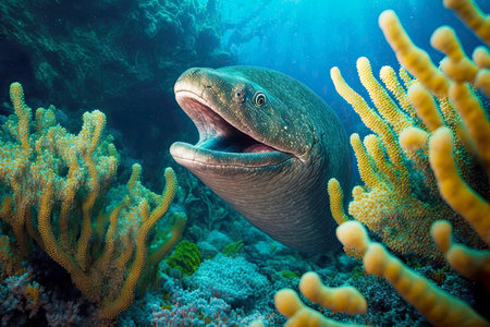 A captivating view of a moray eel emerging from its coral habitat. This underwater scene showcases the vibrant marine life and intricate details of nature.
