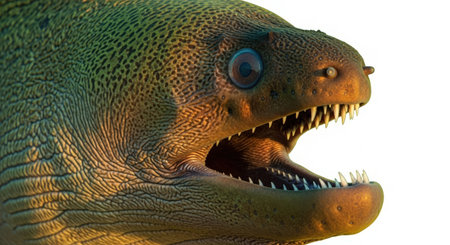 Moray Eel displays intricate patterns and textures in this close up providing a detailed look at its vibrant colors and unique head structure against a clean background.