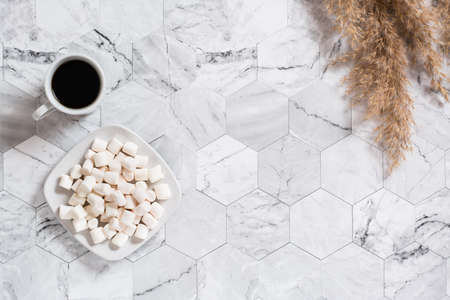 A cup of black coffee, marshmallows on a plate and dry ears on a marble background. Eco friendly template. top view.