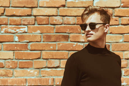 Art portrait. Handsome young man model posing in black pullover sunglasses next to brick wall. Men's style, beauty. Fashion shot.