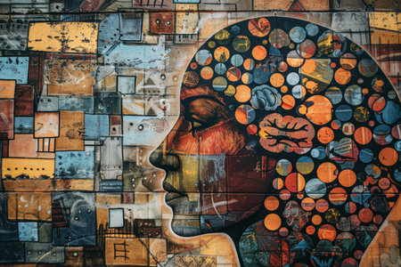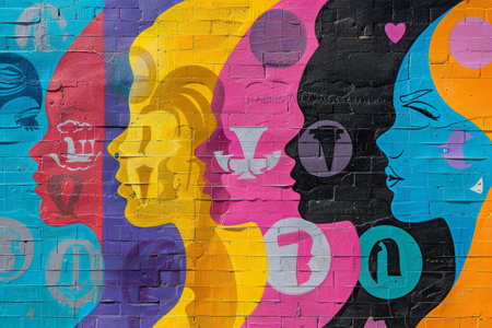 Colorful mural of a womans face painted on a brick wall in a vibrant and eye-catching display, Exploring the theme of gender equality and social justice