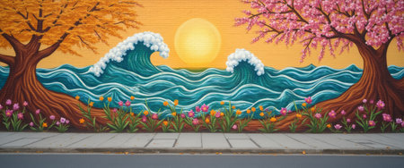 This stunning mural showcases a dynamic scene with crashing waves, flanked by autumn and spring trees under a radiant sun. The vivid colors and intricate details create a lively atmosphere, celebrating natures beauty and the changing seasons.