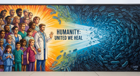 A powerful and inspiring street art mural titled 'HUMANITY: UNITED WE HEAL.' It vividly depicts a diverse group of people, led by a healthcare professional, standing united and pushing back against a swarm of stylized viruses, symbolizing collective resilience during a pandemic.
