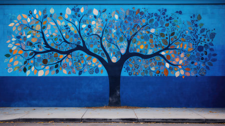 mural blue tree of life illustration building city, branches wall, connection urban mural blue tree of life