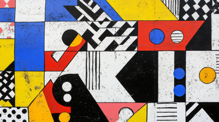 Colorful geometric shapes and patterns form abstract art on a wall, Incorporating geometric shapes and patterns