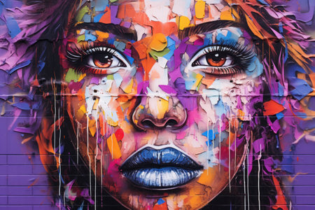 Vibrant street art portrait of a woman with bold colors and intricate details