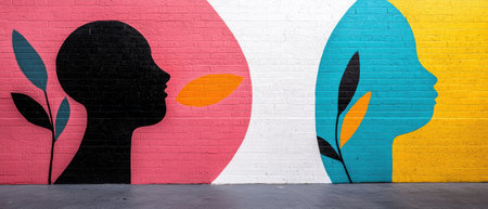 Abstract Mural Art with Colorful Overlapping Human Profile Silhouettes on Concrete Wall