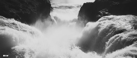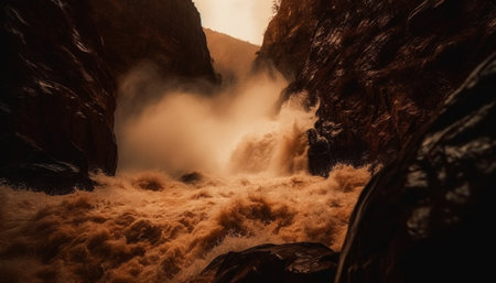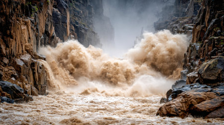 A wild surge of brown water roars through a steep canyon, colliding with rugged stones and forming explosive sprays amid a rugged, untamed terrain.