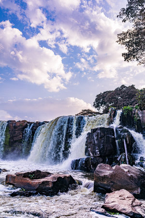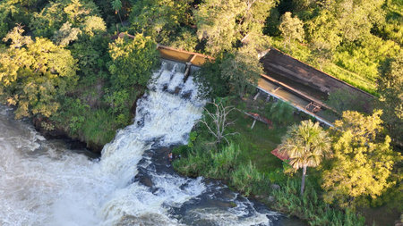 Cassilandia, Mato Grosso do Sul, Brazil - 04 20 2024: aerial image of the Salto Do Rio Apore tourist spot in cassilandia