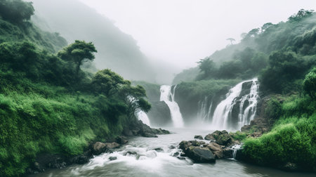 Long exposure of a waterfall in the middle of the jungle with green vegetation