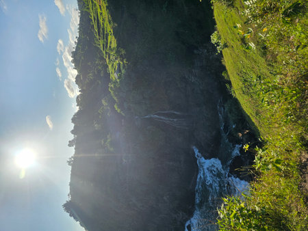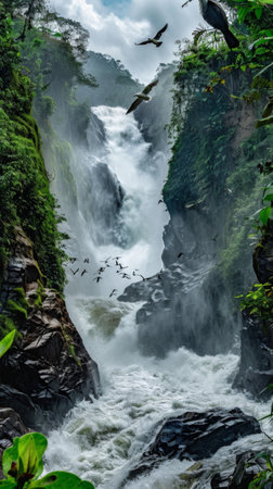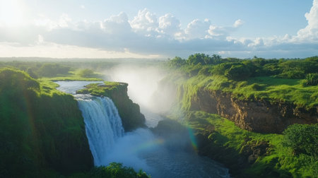 A powerful waterfall cascades into a verdant canyon, creating a misty spectacle under a bright sky.
