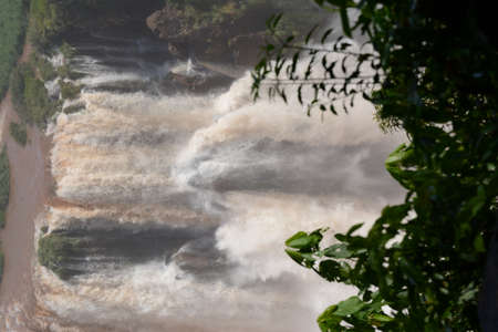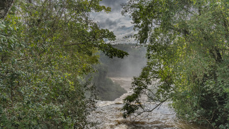There is lush tropical vegetation on the banks of a stormy river. Spray from the waterfall in the air. Clouds in the sky. Argentina. Iguazu Falls.