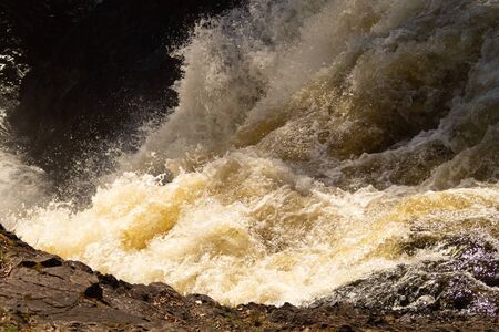 a turn on a mountain river, rushing water with spray and foam, big rocks and rushing streams