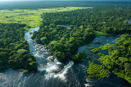 Aerial view of the amazon rainforest and river, with lush green trees surrounding it. the rivers have flowing water that is crystal clear with low human pollution. there is an open space in front where you can see vast grasslands stretching out beyond the forest, showing how expansive these forests