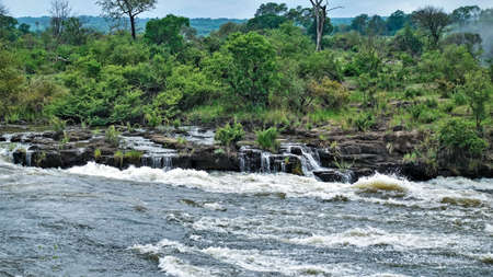 The Zambezi River is approaching Victoria Falls. Water rushes in a powerful stream, boils and foams. On the rocky shore, there are ledges, small waterfalls. Lush jungle all around. Zimbabwe.