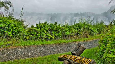 Victoria Falls park has green vegetation. A rocky path goes over the gorge. Powerful streams of water are hidden in a misty haze. A wooden sign shows the direction to the observation deck. Zimbabwe.