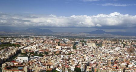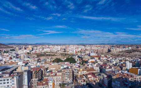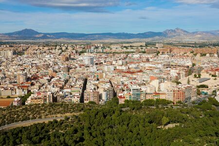 Aerial view of the northern part of the city of Alicante, in Spain, at sunny day and mountains with clouds.