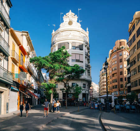 Valencia, Spain - June 3, 2017: Modern architecture in the old city center with locals and tourists. City life of Valencia